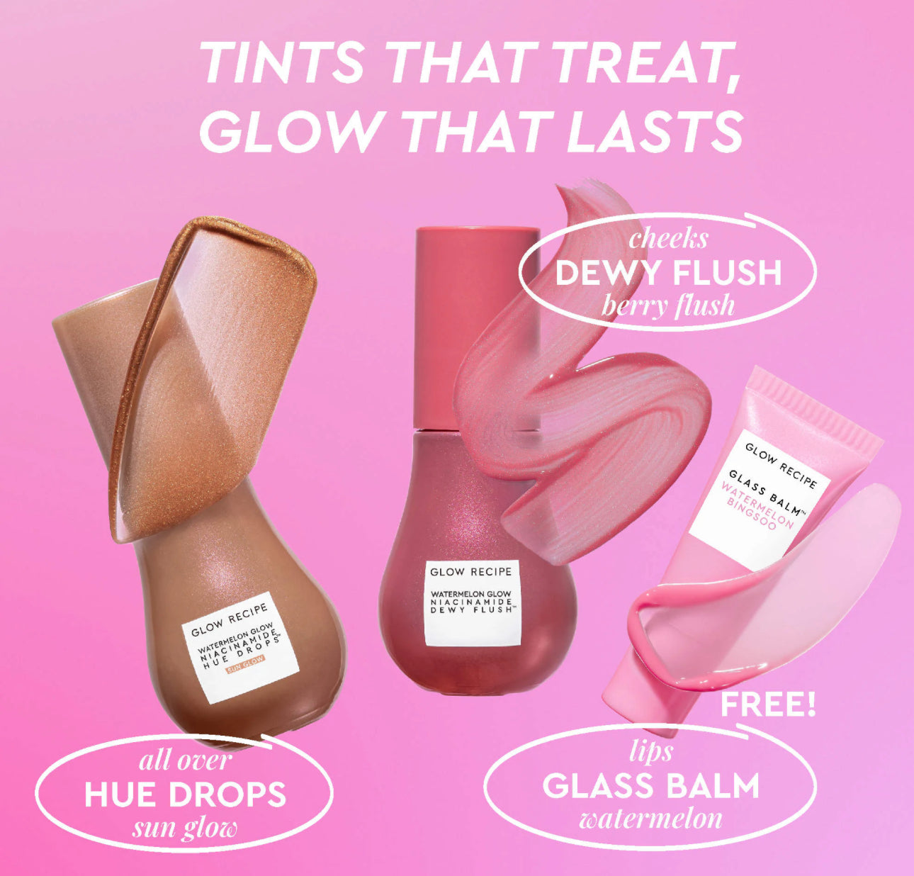 اصنعي إشراقتك المميّزة مع هذا الثلاثي السهل والعملي. ابدئي بـ Mini Watermelon Glow Niacinamide Hue Drops لمنح البشرة لونًا شفافًا مضيئًا يوحّد المظهر ويعزّز الإشراقة. ثم أضيفي Watermelon Glow Niacinamide Dewy Flush ليمنح الخدود لمسة لون طبيعية قابلة للبناء مع لمسة ندية مشرقة. وأنهي الإطلالة بـ Watermelon Glass Balm Lip Treatment لتنعيم الشفاه وترطيبها بلمعان مغذٍ وجذّاب.